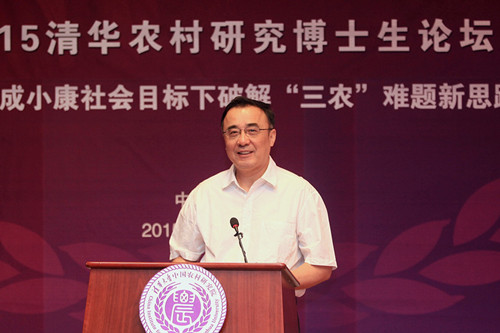 7月4日上午,“2015清华农村研究博士生论坛”在清华大学举办。论坛由清华大学中国农村研究院(以下简称农研院)主办,主题是“全面建成小康社会目标下破解‘三农’难题新思路”,分为开幕致辞、专家演讲、分论坛、博士生学术论文报告会、论坛总结暨颁奖仪式五个环节。中央农村工作领导小组副组长、办公室主任、农研院院长陈锡文,全国政协民族和宗教委员会副主任、国务院参事、农研院指导委员会委员杜鹰,清华大学国情研究院院长、农研院学术委员会副主任胡鞍钢出席论坛并发表演讲。中央财经领导小组办公室副主任、中央农村工作领导小组办公室副主任、农研院副院长韩俊主持论坛开幕致辞和专家演讲环节。清华大学副校长谢维和出席论坛并作开幕致辞。