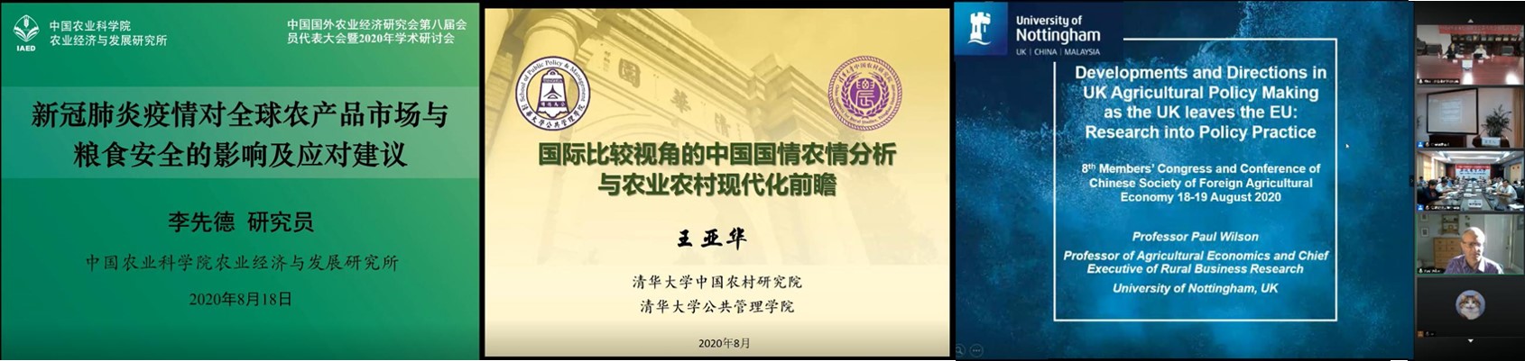 2020年8月18日,中国国外农业经济研究会第八次会员代表大会暨2020年学术研讨会隆重举行。在会员代表大会上,选举产生了研究会第八届理事会和监事会。中国社会科学院农村发展研究所副所长苑鹏研究员当选新一届研究会会长,清华大学公共管理学院副院长、中国农村研究院副院长王亚华教授等17人当选新一届研究会副会长。在大会的主旨报告会上,中国农业科学院农业经济与发展研究所李先德研究员、清华大学公共管理学院王亚华教授、英国诺丁汉大学Paul Wilson教授分别作了学术报告。